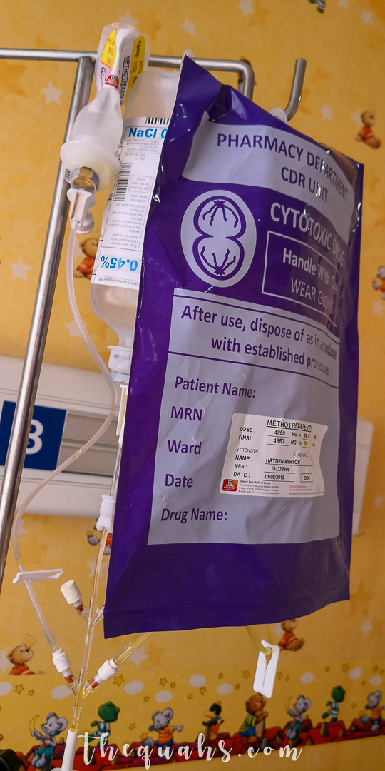 So, #theSmally treatment has a combination of various drugs, depending on his protocol/phase. There are some protocols that are easier, with just a dose of Vincristine into his Hickman line when we visit, and there are some which are horrid, such as getting admitted into hospital to do his Cyclophosphamide drips, or his high dose Methotrexate drips, which makes him nauseous and vomiting for days even with anti-vomiting medication.