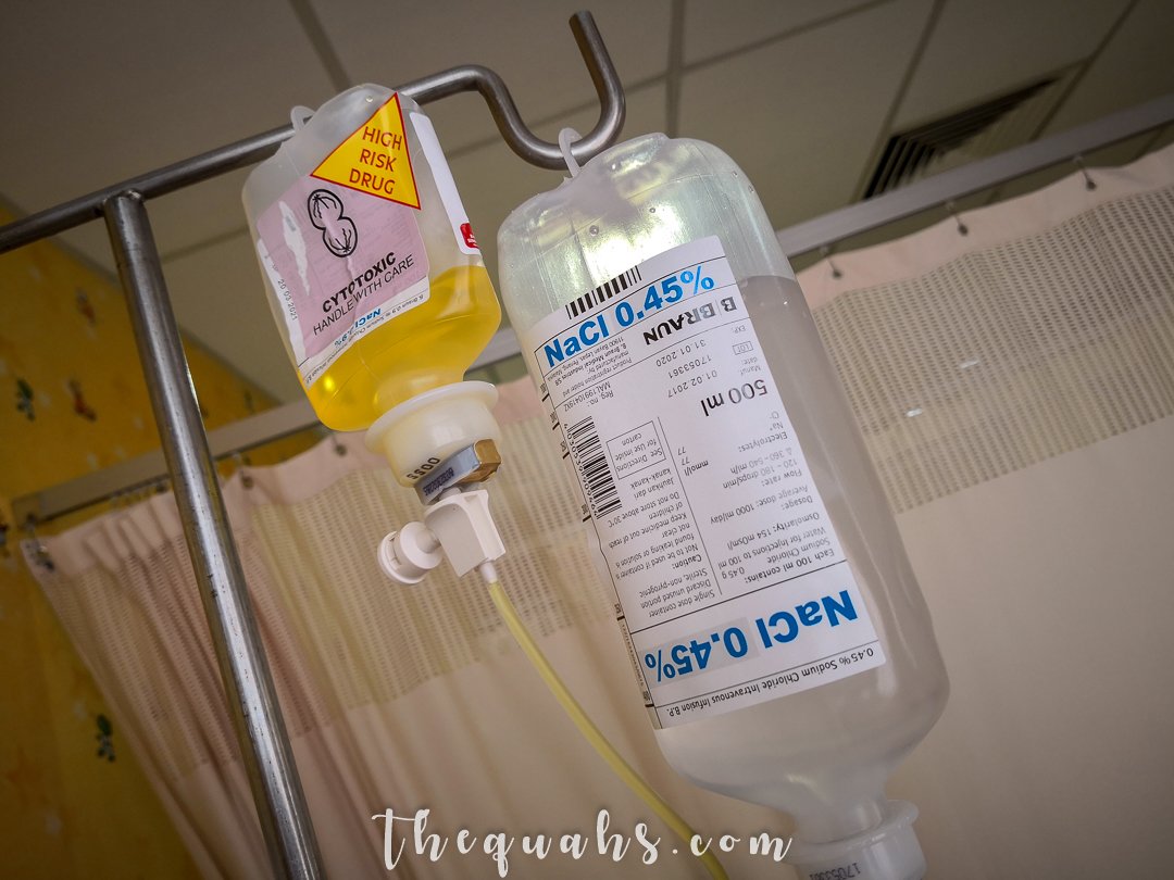 Just after his Hickman Line was inserted, he has to undergo his Cyclophosphamide treatment and at least 3 days of staying in the hospital to ensure he is properly hydrated.